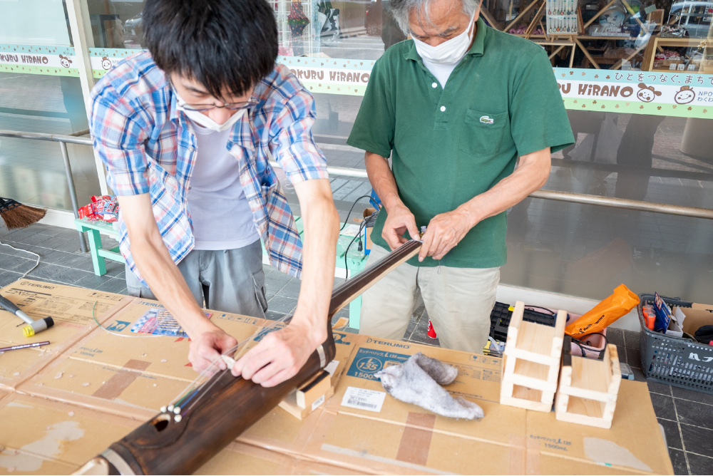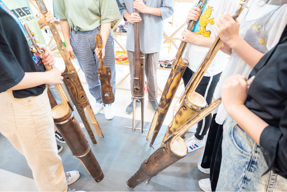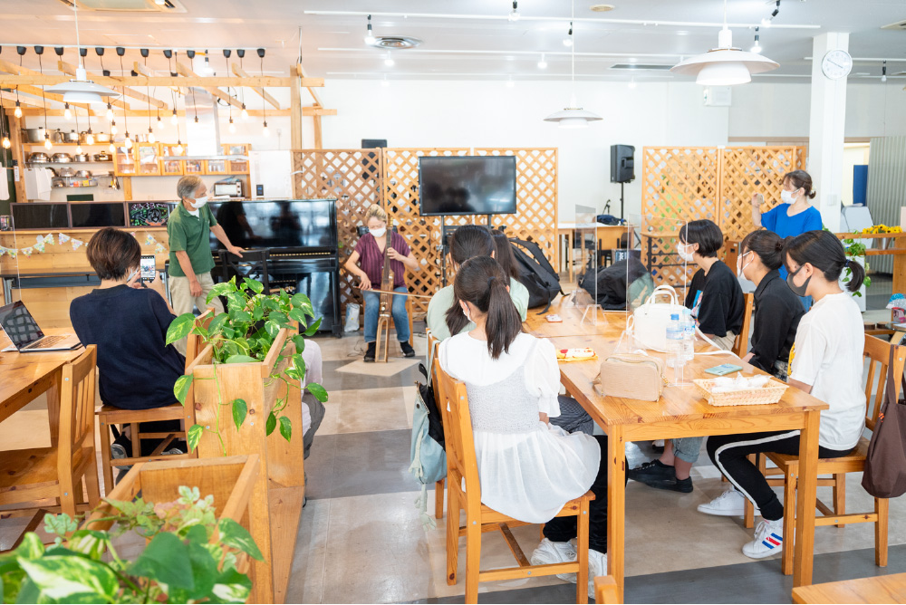 この日は、近くの高校の学生たちと一緒に、竹チェロづくりのワークショップを開催していました。利用者の一人、藤田宙さんは竹の楽器づくりのインストラクターの資格を得ています。師匠は「彼はクリエイティブな能力が高い。あと段取りがいいですね」と藤田さんのことを見込んでいます。高校生たちも、「初めて自分で作った楽器で、演奏できるのが楽しみ!」と話します。