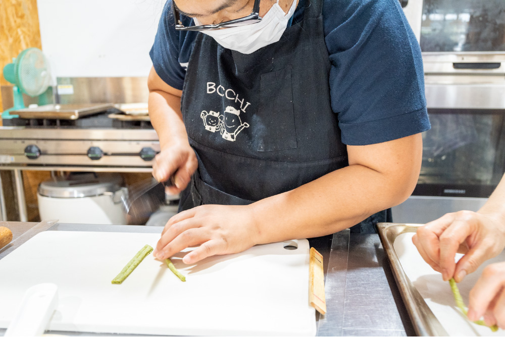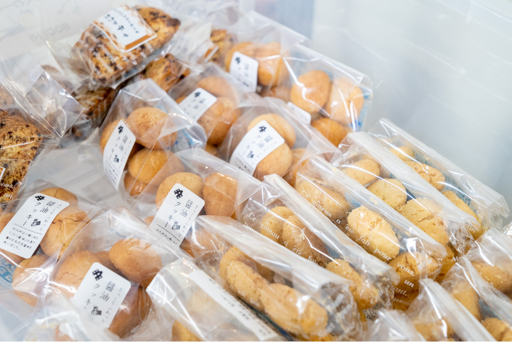 今回「日々のてまひま」で販売する「酒かすすてぃっく」を始め、BOCCHIで作るお菓子には、八幡らしさが込められています。酒かすすてぃっくには地元の溝上酒造の酒粕を使っているし、地ビールのホップを練り込んだクッキーや、地元醤油蔵の味噌や醤油を使ったサブレも人気です。小橋さんは、「私自身が八幡を大好きなのと(笑)、福祉事業所でつくるものって同じようなものになりがちなので、ここならではのものにしたかったのが動機です」と話します。商品の独自性を実現できるだけでなく、地元のメーカーとコラボすることで気軽に行き来できる関係にもなるのだそう。溝上酒造の蔵開きで、BOCCHIの利用者が販売を手伝う、なんてことも。