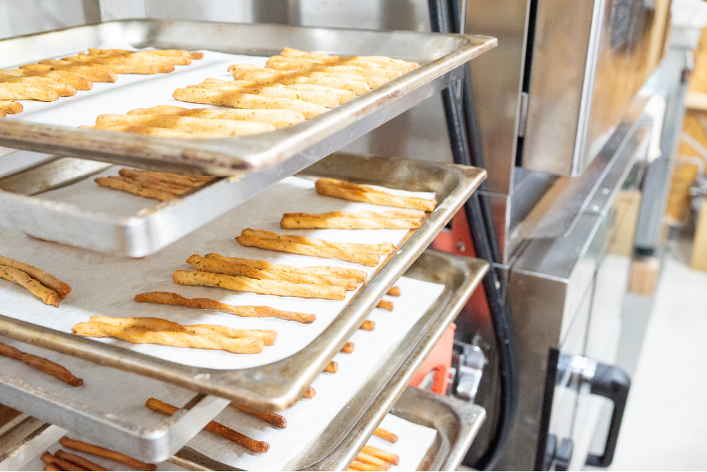この日作業をしていたのは西竹さん。これまでは袋詰めを担当していましたが、この日は初めての「焼き」担当。酒かすスティックを丁寧に天板に並べ、慎重にオーブンに運びます。