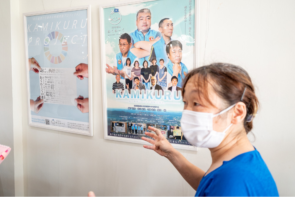 BOCCHIを運営しているNPO法人「わくわーく」は、お菓子同様に様々な方法でまちと接点を持っています。その一つが「カミクルプロジェクト」。エプソンが、水を使わずに古紙から新たな紙を再生することができるマシンを開発しており、これを活用できる方法を模索していると聞いて、小橋さんは真っ先に手を挙げます。「うちの利用者さんたちが、古紙回収と選別を仕事として請け負うことができればと思って」。新たに生み出された紙でさらにお菓子のパッケージを作る、という好循環も起きています。