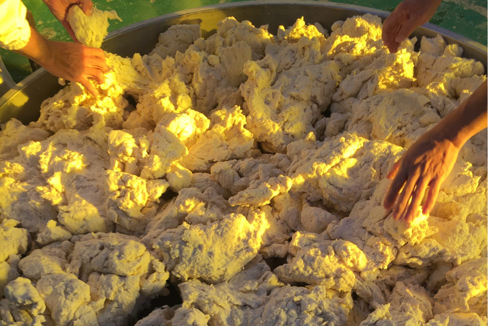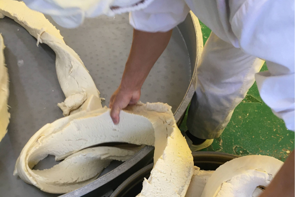 ここでは46名の知的ハンディキャップのある従業員と、11名の支援員が一緒に働いています。なんと一日に1トンもの小麦を使用して、日々商品を製造しています。