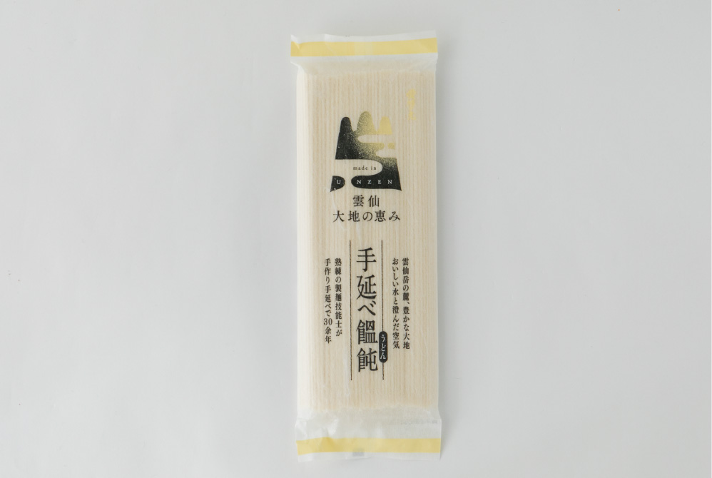 島原半島雲仙岳の麓に位置するコロニーエンタープライズでは、昔ながらの手延べ製法によるそうめんづくりが行われています。工場内で乾燥を待つそうめんの様子は、まるで真っ白なすだれのよう。原料の小麦にもこだわり、しなやかでコシがあっておいしいと評判です。そうめんづくりのノウハウを活かしたうどんやラーメンなどの商品開発もさかんで、最近では話題の低糖質麺も手掛けています。